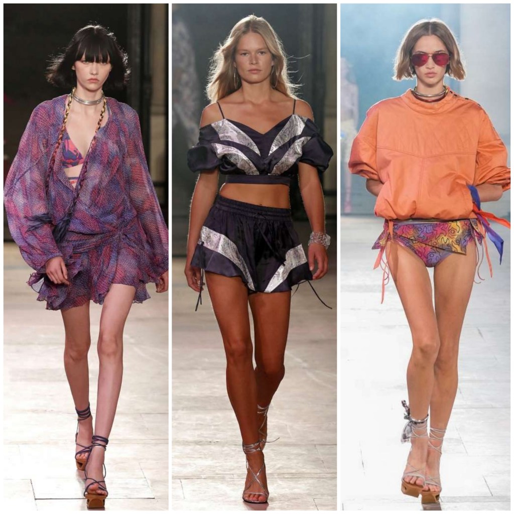 У календарі – осінь, а Isabel Marant згадує літо, пляж та Майямі. Шорти та футболки, комбінезони з шовку та блузи-оверсайз, костюми а-ля вісімдесяті та денім з ефектом омбре, шифонові блузи та міні-сукні, кроп-топи та легкі об’ємні вітровки – все це відтворювало атмосферу та настрій літнього відпочинку. А незабутні фарби заходу сонця дизайнерка вплела в колірну палітру: почавши з відтінків жовтого і помаранчевого, вона поступово перейшла до рожевого та фіолетового.